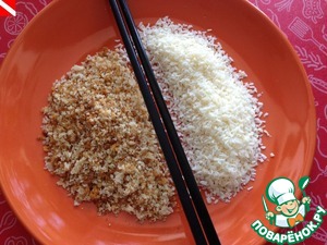 За это время готовим панировку - в равных пропроциях смешиваем кокосовую стружку и панировочные сухари,