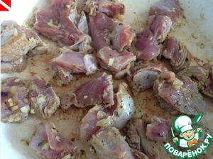 • На сильном огне разогреваем масло, затем огонь убавляем до среднего, выкладываем мясо и обжариваем (не помешивая) 2-4 минуты.
