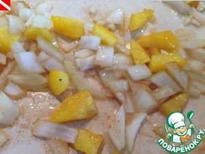 • На этой же сковороде обжариваем лук, чеснок и сладкий перец - 4-6 минут, до готовности лука.