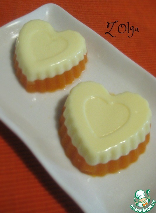 Подогреть желатин (не кипятить!), постоянно помешивая. Разделить его на 2 части - по 100мл.