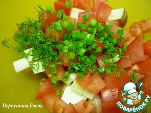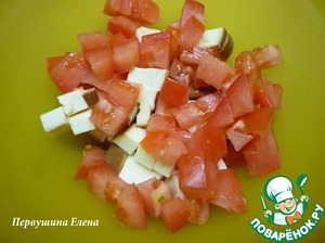 • Помидор так же нарезать кубиками и положить к сыру.