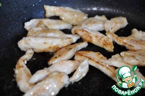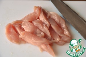 Куриное филе (грудку) промакиваем бумажным полотенцем и режем тонкими полосками.