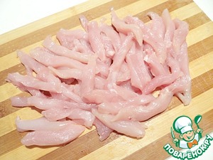 Куриное филе мою и нарезаю тонкими длинными брусочками.
