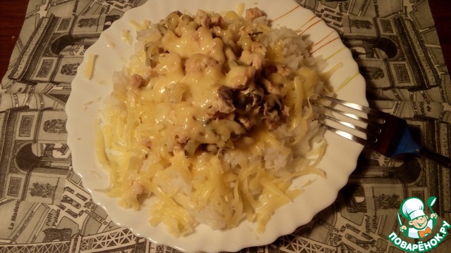 Готовлю блюдо до загустения соуса и до исчезновения кусочков плавленного сыра. Подаю куриное филе с соусом, посыпав тертым пармезаном, с рисом. Можно украсить блюдо зеленью петрушки. Приятного Вам аппетита!