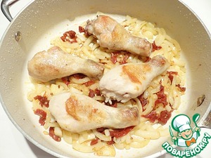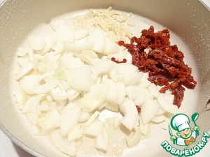 Голени вынимаю из сковороды, обжариваю в ней лук, чеснок и нарезанные вяленые томаты.