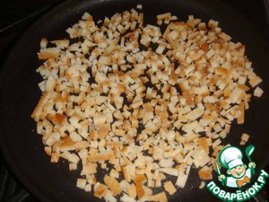 Батон нарезать мелкими кубиками и обжарить сухарики в раскаленной духовке или на сковороде с небольшим количеством масла
