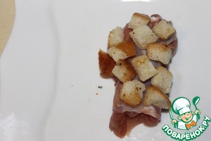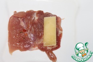На отбитое куриное филе положить кусочек сыра, завернуть рулетиком, -