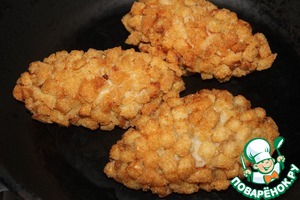 Обмакнуть во взбитые яйца, потом в муку, потом в яйца и обвалять в сухарях. Хорошенько прижать сухарики.
