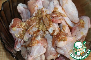 Мариновала крылышки я заранее за сутки. Смешала раздавленный чеснок, молотую папарику, оливковое мало, соль, черный перец, розмарин