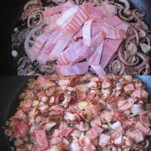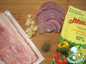 Тем временем, лук режем полукольцами, чеснок-тонкими пластинами, бекон-полосками.