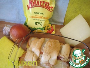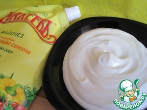 Смешиваем сметану и майонез до однородности. Я использовала майонез "Махеев" с лимонным соком-он добавляет пикантную нотку блюду.