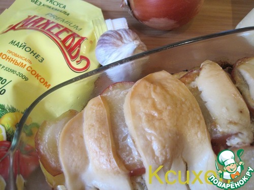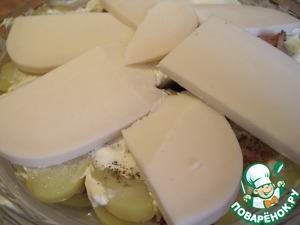 Будущий Тартифлет польём вином и выложим сверху ломтики сыра. Запекаем 20-25 минут или до золотистого цвета.