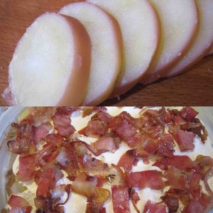 Духовку включаем на разогрев t=210 градусов. С картофеля сливаем воду, даём немного остыть и очистим от кожуры. Нарезаем картофель ломтиками (1 см толщиной). В форму, смазанную сливочным маслом, выкладываем слой картофеля, посолим-поперчим, промажем сметанно-майонезной смесью. Выложим смесь лука с беконом. Повторим слои, пока не закончатся ингредиенты.