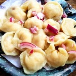 В отличие от других пельменей фарш нарезается мелкими кубиками, а не рубится в мясорубке.