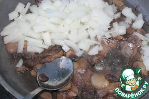 Сначала жарим шампиньоны, которые дают много сока, а потом лук до румяности, но в этом соке он будет тушиться. Обжарить до румяности его можно положив первым в сковороду.