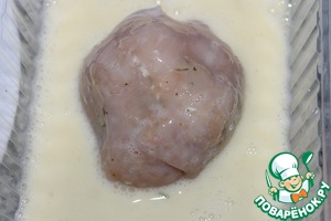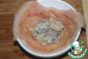 Уложить отбитое мясо в пиалку, в центр - столовую ложку жюльена. Завернуть шариком