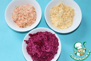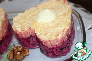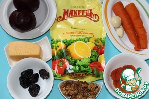 В отдельных мисках перемешиваем: свеклу, чернослив, грецкие орехи с майонезом; морковь с курагой и майонезом; сыр с чесноком и майонезом. Слои для будущего салата готовы.