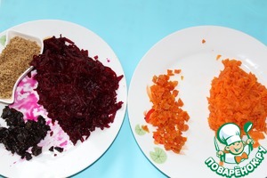 Свеклу и морковь натираем на крупной терке, орехи перемалываем блендером в мелкую крошку, но не муку. Курагу и чернослив нарезаем на мелкие кусочки.