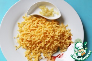 Сыр натираем на крупной терке, чеснок пропускаем через давилку для чеснока.