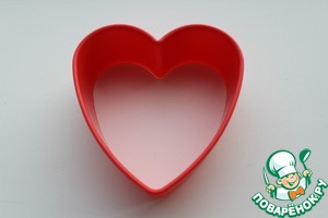 Для подачи выбрана форма в виде сердечка, в которое плотно укладываем подготовленные продукты: свеклу, морковь и сыр.