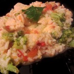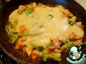 Рис с индейкой, брокколи и томатами в сырном соусе