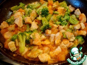 Добавим брокколи, немного солим и перчим (соус довольно соленый, не перестарайтесь), перемешиваем.
