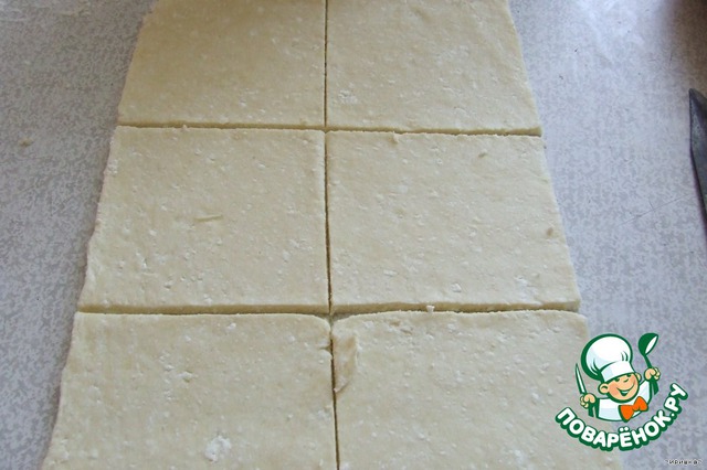 Тесто раскатать, разрезать на квадраты примерно 8*8 и толщиной около 1см.