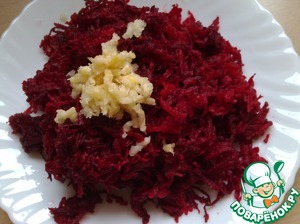 Свеклу натереть на мелкой терке. Чеснок выдавить через пресс.