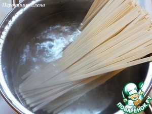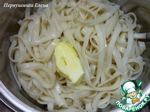 Добавить к лапше 2 ст. л. сливочного масла. Когда масло растает, перемешать лапшу, выложить ее на дно широкой кастрюли и закрыть крышкой.