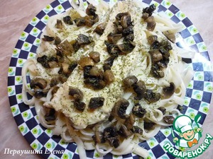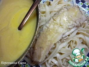 Осторожно вынуть филе камбалы лопаткой (чтобы масло стекло) и выложить на лапшу. Слить жидкость, оставшуюся от запекания рыбы, в сотейник. Нарезать сыр и