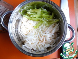 Сыр натереть на крупной тёрке. Яблоко очистить и так же натереть. Болгарский перец нарезать соломкой.