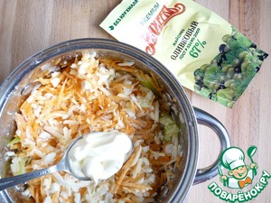 Все ингредиенты соединить. Добавить майонез. Я использую майонез оливковый "ТМ Махеевъ".