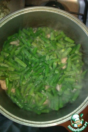 После добавляем стручковую фасоль, солим немного и перемешиваем. Тушим как и грибы 10-15 минут.