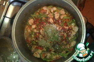 Добавляем укроп. Перемешиваем. Пробуем на соль, добавляем перец, пробуем грибы и стручковую фасоль. Если они мягкие то блюдо готово. Хорошо сочетается с бокалом красного вина.