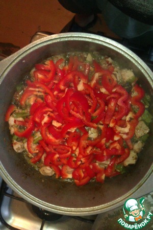 Добавляем красный перец сладкий, перемешиваем. Тушим 10 минут.