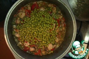 Добавляем зелёный горошек. Перемешиваем. Тушим 3 минуты.