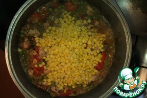Добавляем кукурузу. Перемешиваем. Тушим 3 минуты.