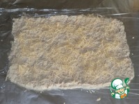 На фольгу кладем пищевую пленку (для удобства сворачивания рулета). Выкладываем слой из рыбного фарша. |