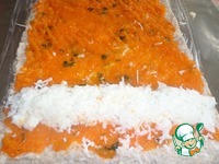 Выкладываем слой тыквенного пюре. Белок натереть на мелкой терке и кладем на край рулета, чтобы в середине рулета была начинка из белка. |