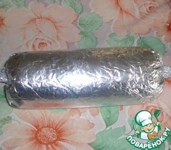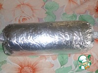 С помощью пищевой пленки аккуратно сворачиваем рулет. Заворачиваем рулет в фольгу. Ставим в холодильник для застывания. |