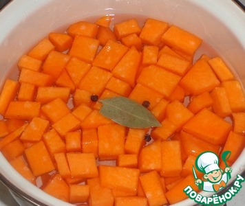 Тыкву очистить, порезать на кубики, отварить также как и рыбу в подсоленной воде с лавровым листом и перцем. |