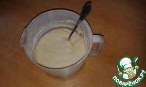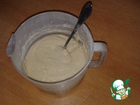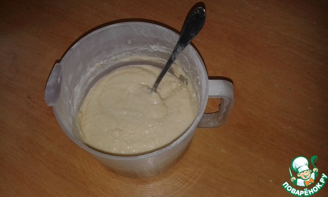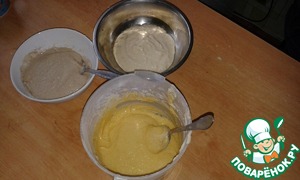 Добавляем в смесь сахара и сметаны мягкое сливочное масло, соду, разбухшую манку и муку. Все тщательно перемешиваем.