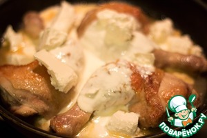 Куриные окорочка, приготовленные в густом соусе из сливок, орехов, чеснока и брынзы.