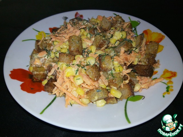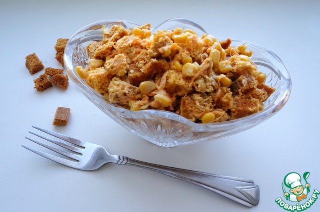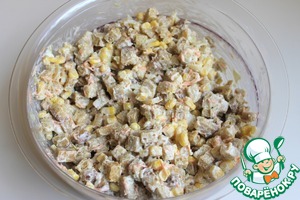 Затем добавляем майонез. Его кладем не жалея. Нам нужно чтобы все сухарики были в майонезе. Очень хорошо все перемешаем. И закрываем крышкой чашку, убираем примерно на 4 часа, я делаю всегда утром если подавать нужно вечером. Когда салат будет готов, cухарики напитаются майонезом и будут похожи как будто обжаренные в масле. Очень вкусное и сытное блюдо.