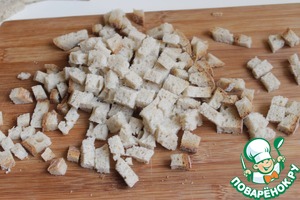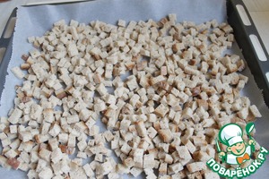 Итак у нас получится целый лист таких вот кубиков. Ставим их в духовку разогретую до 160 гр. примeрно на 25 минут подсушить. При этом периодически перемешиваем их.