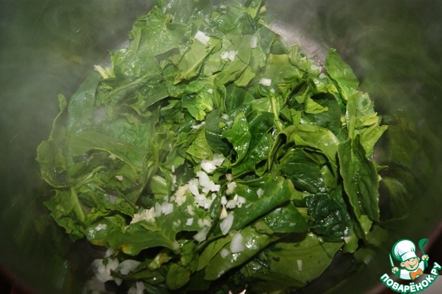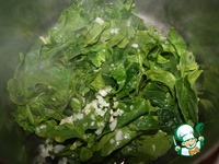 Нагреть в сотейнике 15 гр. масла и протушить в нем шпинат с 1 ст. л. нарезанного зеленого лука (белая часть) и 1 зубком чеснока пропущенным через пресс. Тушить 5 минут. Дать остыть и отжать от сока. Пюрировать в блендере. Добавить немного укропа, посолить и поперчить.