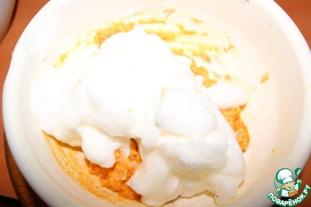 В емкость с пюрированной морковью добавить 30 гр. муки и половину белков. Перемешать лопаткой.