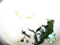К пюрированному шпинату добавить 30 гр. муки и оставшиеся белки. Перемешать.
