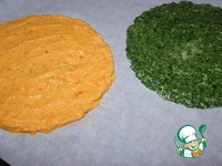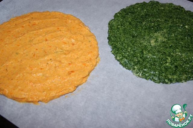 На листе пекарской бумаги начертить 2 круга диаметром 20 см. В один поместить шпинатное тесто, в другой морковное. Выпекать в прогретой до 180°С духовке 20 минут. Ориентируйтесь на вашу духовку!