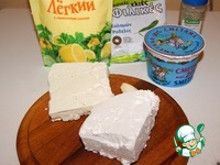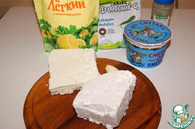Пробить в блендере сыр фета, творог 350 гр. и пропущенный через пресс зубок чеснока. Добавить сметану 250 гр, майонез 100 гр. и хорошо перемешать.